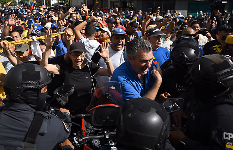 Die Zeremonie fand inmitten massiver Oppositionsproteste statt. Im ganzen Land demonstrierten sie mit Parolen wie "Ruhm dem tapferen Volk" und "Freiheit, Freiheit" gegen Maduro. Oppositionsführerin María Corina Machado wurde bei ihrem ersten Auftritt seit Monaten begeistert gefeiert.