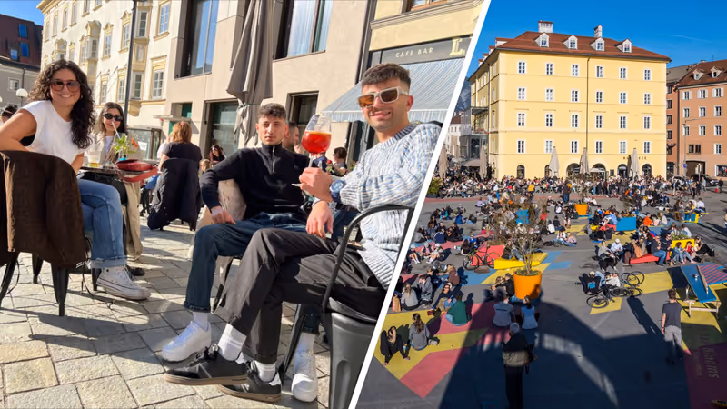 Bei einem kühlen Getränk am warmen Kufsteiner Stadtplatz lässt es sich gut aushalten (links). Der Marktplatz in Innsbruck ist sowieso der Klassiker bei Sonnen-GenießerInnen (rechts).