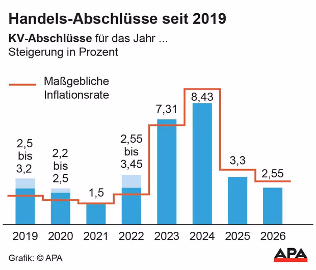Arbeitgeber- und Arbeitnehmervertreter haben sich in der dritten Verhandlungsrunde auf einen Handels-KV-Abschluss unter der Inflationsrate geeinigt. Die Kollektivvertragsgehälter steigen mit 1. Jänner 2026 um 2,55 Prozent. Die den Verhandlungen zugrunde liegende Jahresinflation betrug 3 Prozent. „Wir haben in einer schwierigen wirtschaftlichen Situation einen sozialpartnerschaftlichen Kompromiss geschlossen“, sagte GPA-Bundesgeschäftsführer Mario Ferrari.