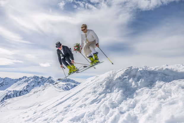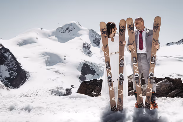 „Die Wildspitze im Hintergrund, die selbst gebauten Skier in der Hand, der perfekte Tag für die standesamtliche Trauung“ war es für Stephi und Rudi Tangl am Pitztaler Gletscher.