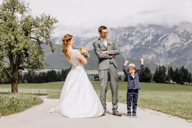 Martina und Lucas Köfler gaben sich in Völs das Jawort. Der kleine Hannes wollte nicht alles sehen.