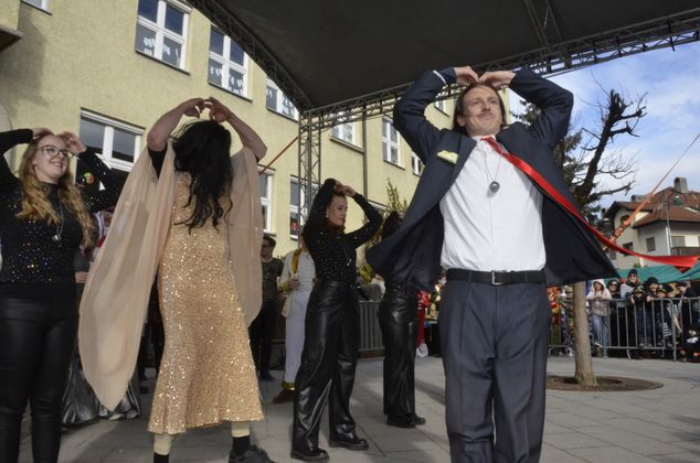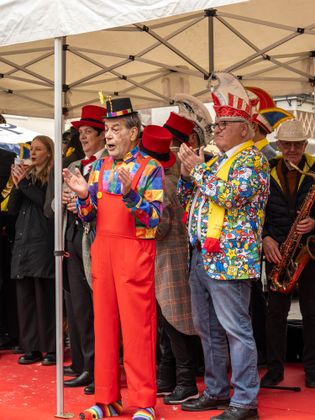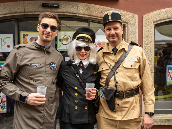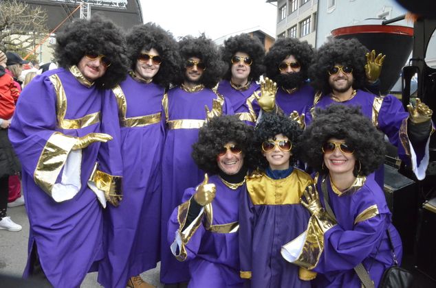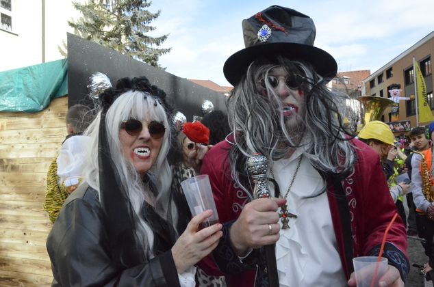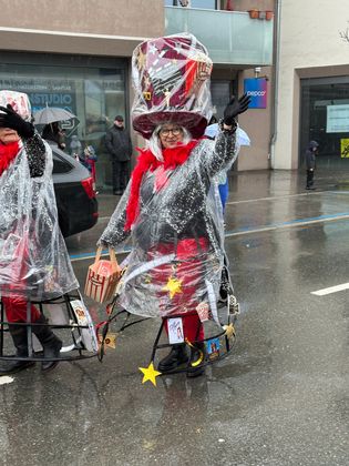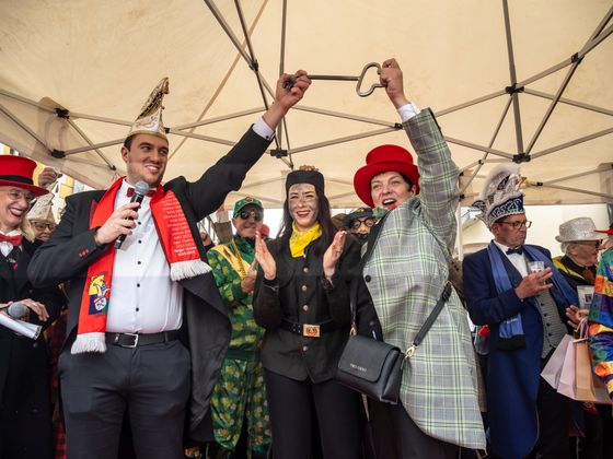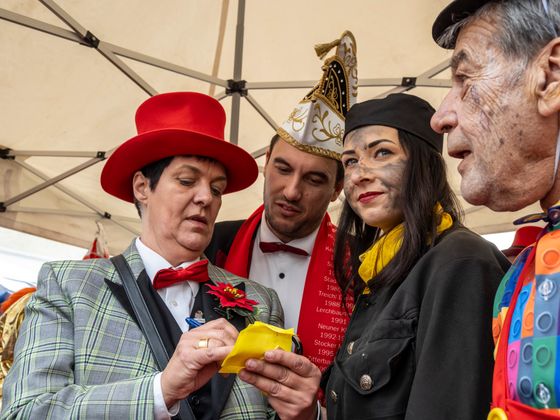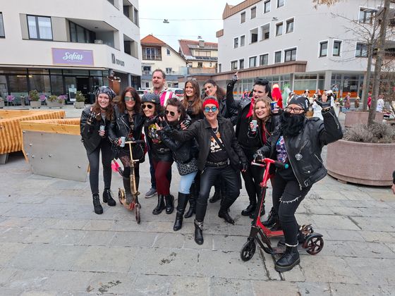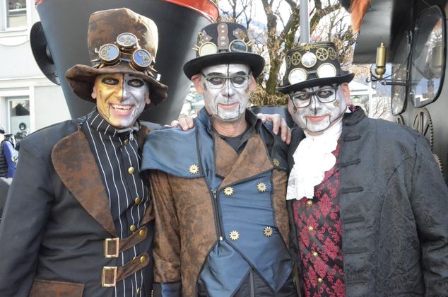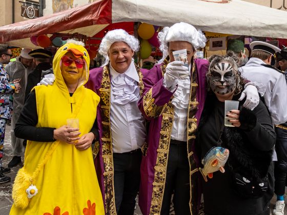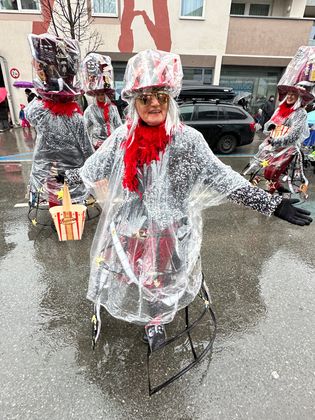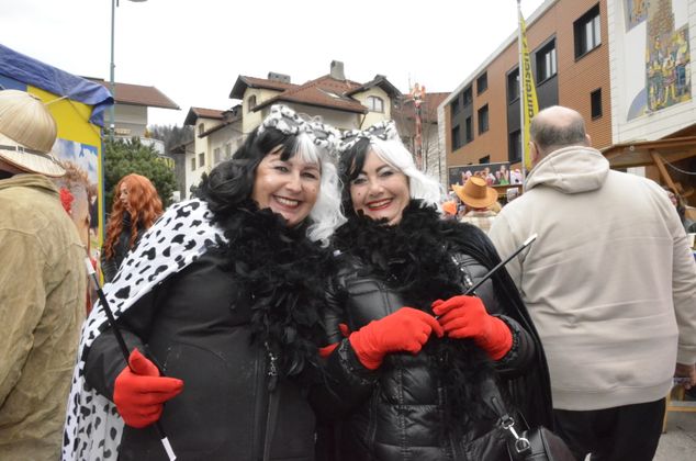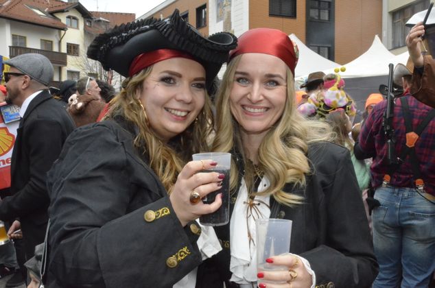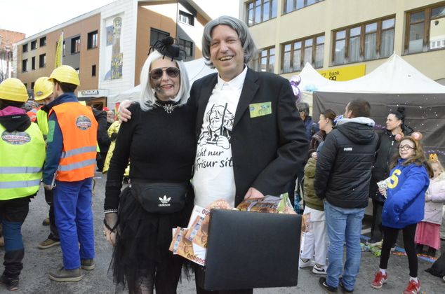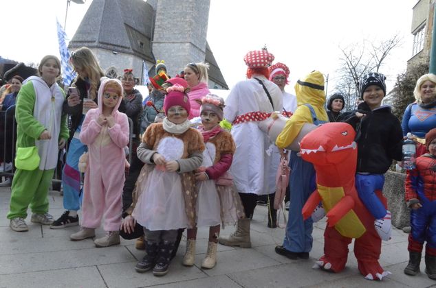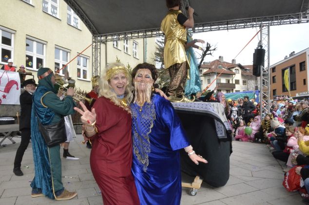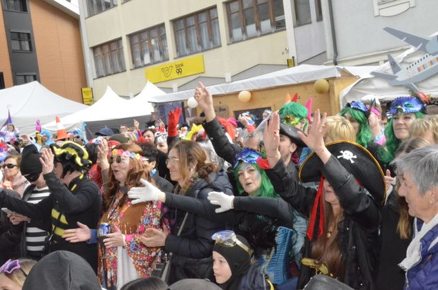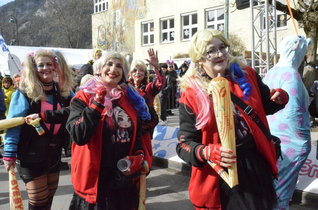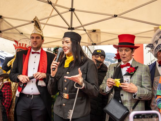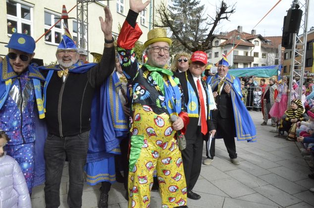 Insgesamt 18 Gruppen machten sich vom Sparkassenplatz aus auf, um die Kramergasse mit närrischem Treiben zu erfüllen. Nicht fehlen durfte zu Beginn das Abschneiden der Krawatte von Bürgermeister Stefan Weirather zum Zeichen, dass die Frauen die Stadt übernommen haben.