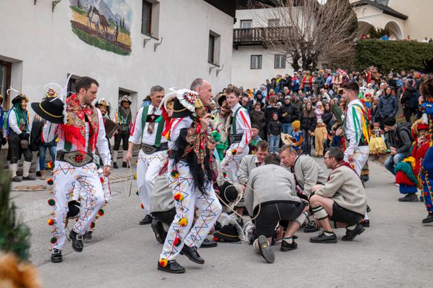 Rau geht es zu, beim Axamer Wampelerreiten, wenn die Reiter versuchen, die Wampler auf den Rücken zu werfen. Der Kampf, der im Zentrum des alle vier Jahre stattfindenden Umzugs steht, symbolisiert das Ringen zwischen Winter und Frühling.