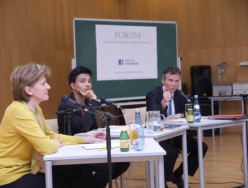 Ein X für ein U können Platzgummer und Oppitz-Plörer den so genannten Erst- und Jungwählern nicht vormachen. Wer zu lange redet, wird höflich, aber konsequent vom Moderator – dem Chefredakteur der Schülerzeitung Annick Shetty – aufgefordert, sich kürzer zu halten. Oppitz-Plörer und Platzgummer antworten so, wie sie es schon seit Wochen tun. Die Formulierungen und Erklärungen kennt man inzwischen. Und doch haben sich beide angepasst. Die Pausenklingel kann keinen aus der Ruhe bringen. Man gibt sich eine Spur amikaler. Das Wort „cool“ wird auch da und dort dezent eingestreut. Und auch das „Du“ rutscht in der Schüler-Aula leichter über die Lippen. Man versucht die Jungen direkter und persönlicher anzusprechen – sie für die Wahl zu bewegen. Immerhin gilt es, die schlechte Wahlbeteiligung vom 15. April ein wenig zu verbessern. Wer dafür verantwortlich sei, wollen die Schüler wissen. Hauptsache wählen gehen, lautet der Sukkus der beiden Politiker. Und Oppitz-Plörer meint gar: „Wenn euch weder Christoph noch ich zusagen – schreibt‘s euch selber hin.“
