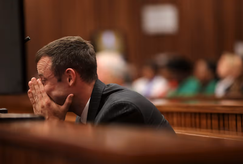 Weinend und das Gesicht in den Händen vergraben, verfolgte der beinamputierte Sportler am sechsten Verhandlungstag den Bericht des Pathologen, der die Leiche der damals 29-Jährigen obduziert hatte. Der schluchzende Angeklagte wurde von seinem Bruder Carl und seiner Schwester Aimee getröstet, die ihm über die Gerichtsbank hinweg Taschentücher reichten.