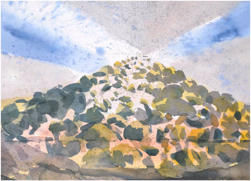 Das bei Reiner Schiestl seit mehr als drei Jahrzehnten immer wieder die zentralspanische Landschaft ist. Die er allsommerlich malt bzw. fotografiert. Wobei für den Tiroler Künstler, der vor wenigen Tagen seinen 75. Geburtstag gefeiert hat, die Fotografie ein selbstständiges Medium ist und nicht etwa als mentale Krücke zum Malen seiner Aquarelle zu verstehen ist, die ausschließlich vor Ort, nie im Atelier, entstehen.