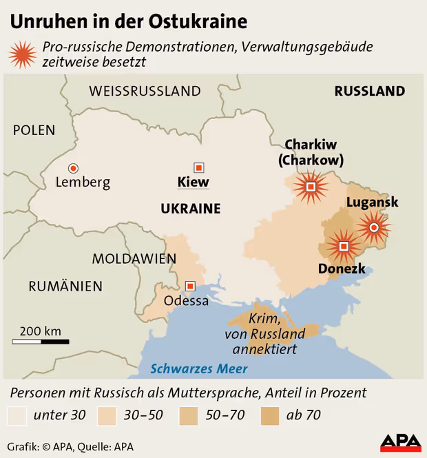 Seit dem Sturz des Präsidenten Viktor Janukowitsch Ende Februar gibt es im Osten des Landes immer wieder prorussische Proteste. Ex-Präsident Janukowitsch hatte Ende März gefordert, in den ukrainischen Regionen Volksabstimmungen über ihren Status abzuhalten. Am Sonntag hatten Demonstranten die Verwaltungsgebäude in Donezk, in Charkow und Lugansk gestürmt und russische Flaggen gehisst. (tt.com, APA/AFP)