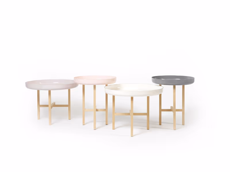 In Kombination mit dem Holz ein sehr haptisches Element. Die einfache, geometrische Formensprache und die schönen Proportionen – den Tisch gibt es in zwei Größen und zwei Höhen – paaren sich auf sehr elegante Art und Weise mit einer subtilen Farbwahl. Weiß, Grau, zartes Rosa, Petrol und Altrosa ist die Palette. Einem Gerücht zufolge kam man auf Altrosa, als man, auf der Suche nach dem exakten Ton, einen uralten Behälter mit Badezimmerfarbe aus den 1970er-Jahren fand; davon ließ man sich inspirieren, und voilà: Eine Farbvariation ist gedämpftes Altrosa.