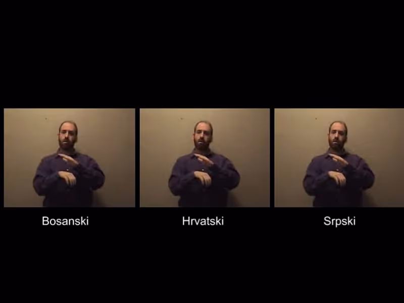 Die Ausstellung tourt durch europäische Städte, am 27. und 28. Juni werden die Videos auch im 21er Haus in Wien präsentiert, im Herbst sind sie beim Videofestival von Trebinje in der Republika Srpska zu sehen. Wo sich in einer ehemaligen k. u. k. Militärkaserne eine von heute insgesamt vier Kunstakademien Bosnien-Herzegowinas befindet. Studiert hat hier auch Igor Bosnjak, dessen „Share“-Beitrag mit dem Titel „BHS“ sich mit den paradoxen Abgrenzungsmechanismen zwischen den Volksgruppen auseinandersetzt, für die gerade die Sprache ein zentrales Vehikel ist. Von Bosjnak in Gebärdensprache übersetzt verschwinden die zum Teil bewusst implementierten Unterschiede aber wieder – die Zeichen für das Bosnische, Kroatische und Serbische bleiben die gleichen.