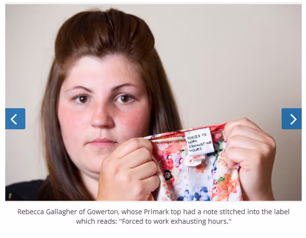 Gowerton – Ein bunt geblümtes Sommerkleid – Rebecca Gallagher aus dem britischen Gowerton hatte ihre neueste Errungenschaft zum Schnäppchenpreis ergattert. Umgerechnet zwölf Euro hatte die 25-jährige Waliserin bei der irischen Billigtextil-Kette Primark für das Trägerkleid bezahlt. Doch die Freude über den vermeintlich guten Kauf währte nur kurz: Als die junge Frau nach der Waschanleitung schaute, fiel ihr ein weiteres Etikett auf, das ebenfalls an die Innennaht des Kleides genäht war. „Forced to work exhausting hours“ (etwa: „Gezwungen, bis zur Erschöpfung zu arbeiten“) war darauf zu lesen – handgeschrieben. Das berichtet die South Wales Evening Post. Wie das Schild an das Kleid gelangte, ist bisher nicht bekannt. Ebensowenig, ob es bereits in der Fabrik in Bangladesch oder erst in Großbritannien befestigt wurde. Die 25-Jährige vermutet dahinter den Hilferuf einer erschöpften Primark-Näherin, „die uns Menschen hier in Großbritannien wissen lassen will, was läuft“.