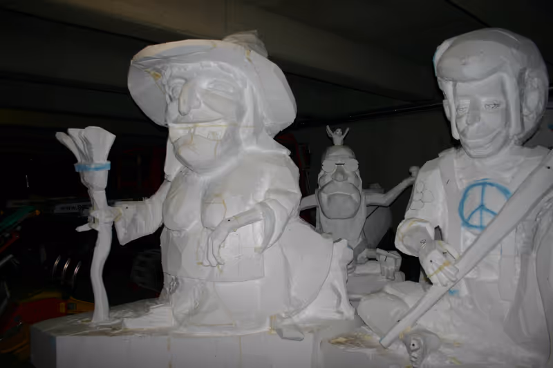 Während Albrecht seiner Figur „Yellow Submarine“ den letzten Schliff verleiht, liefert eine junge Dame, die sich als Blumen-Karin vorstellt, Sonnenblumen, Lilien und Anthurien. „Das ist heute die erste Blumenlieferung. Die Dahlienköpfe kommen erst am Donnerstag, damit sie auch schön frisch für den Umzug sind“, erklärt die Floristin. Sie verleiht den Wägen vor dem Umzug den letzten Schliff, verdeckt etwa kahle Stellen noch mit Blüten, und dekoriert die Feuerwehrautos und Traktoren.