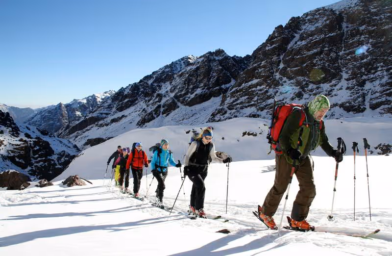 Über den Mizane-Bach beginnt der steile Anstieg auf den Gipfel. Es ist bitterkalt, aber es liegt Neuschnee und der Himmel ist wolkenlos. Durch eine Rinne geht es im Zickzack bergauf. Erbarmungslos brennt die Sonne. Doch der Wind bläst eiskalt und schmerzt im Gesicht. Knapp 100 Höhenmeter vor dem Gipfel lässt die Gruppe die Skier und die Lawinenausrüstung im Schnee und geht zu Fuß durch die vereiste Steinlandschaft. Am Gipfel herrscht plötzlich Windstille. Der Ausblick über die umliegenden Berge und das Wolkenmeer ist atemberaubend. „Bei ganz klarem Wetter kann man sogar die Sahara und den Atlantik gleichzeitig sehen“, versichert Hassim. Am nächsten Tag geht es auf der anderen Talseite erst mit Skiern und dann mit Steigeisen auf den 4083 Meter hohen Gipfel des Ras. Der Aufstieg ist schwer, die Belohnung umso größer: In kniehohem Pulverschnee schwingen sich Siggi, Manfred und Egbert durch Rinnen wieder hinab zur Toubkal-Hütte.